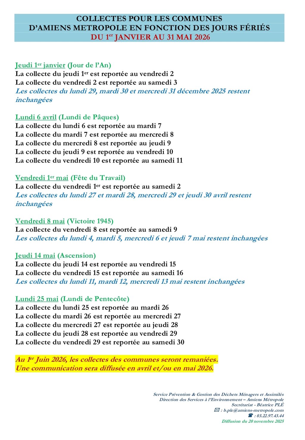 CALENDRIER DES DÉCALAGES DE RAMASSAGE DES OM ET DU TRI SÉLECTIF POUR JOURS FÉRIÉS