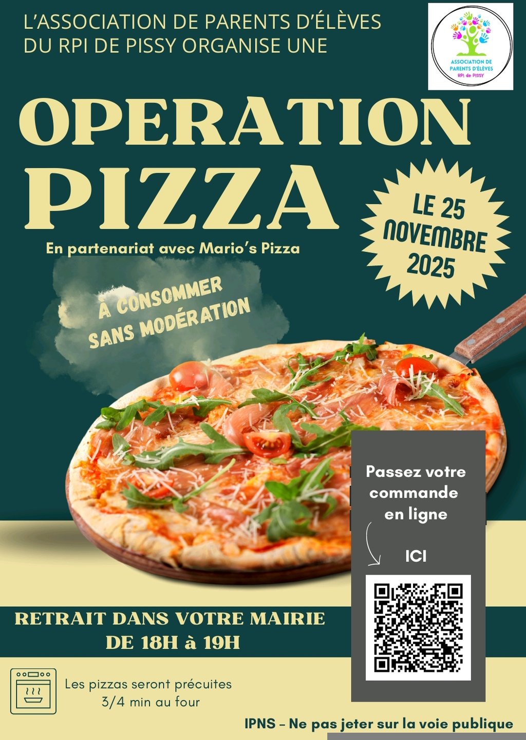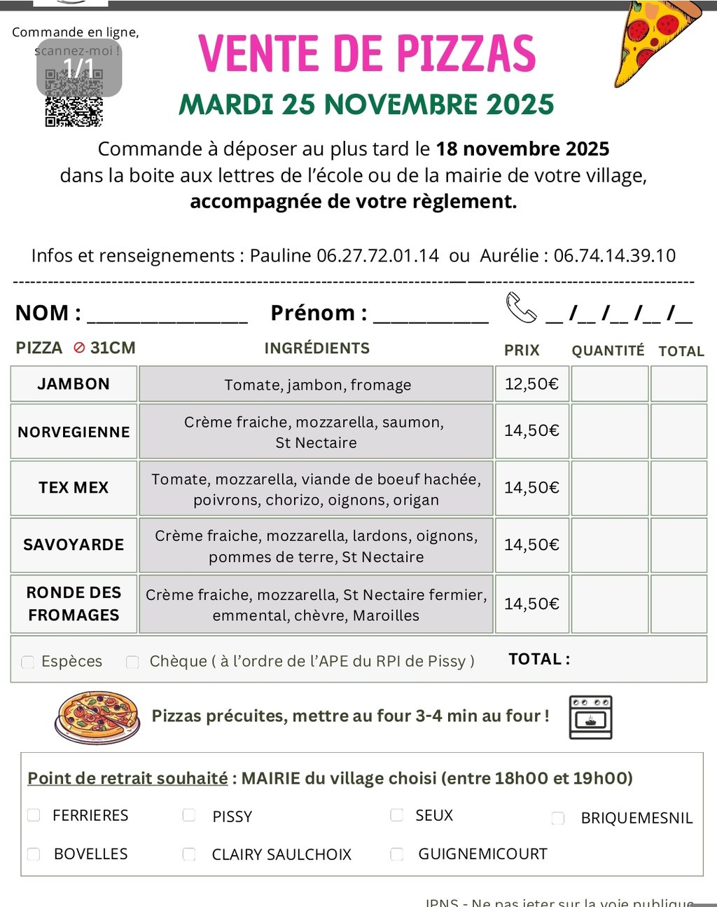 L'association de parents d'élèves du RPI de Pissy vous informe qu'une vente de pizzas aura lieu le mardi 25 novembre 2025.