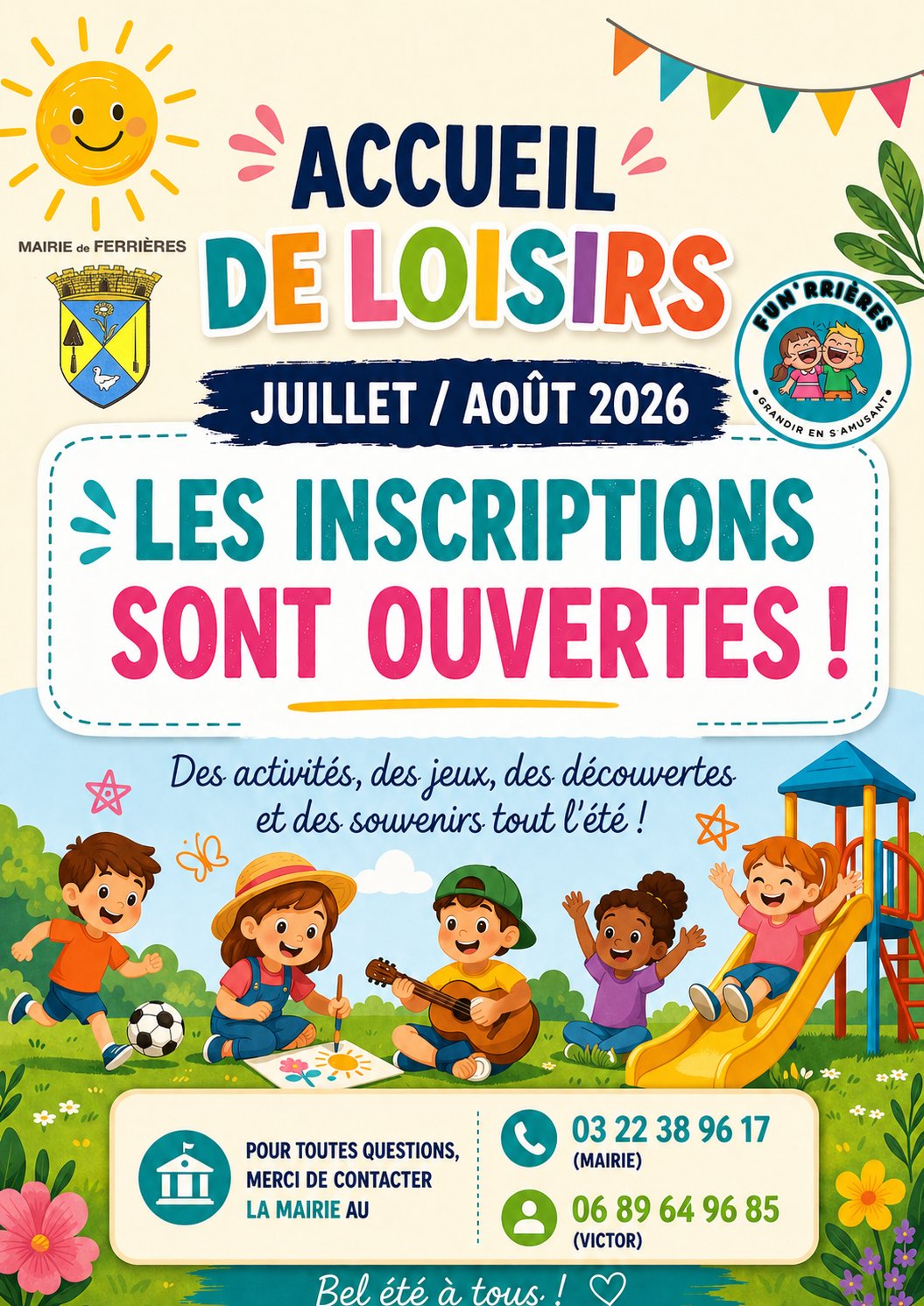 Les inscriptions à l’accueil de loisirs sont OUVERTES pour juillet / août 2026 ( du 6 juillet au 7 août 2026) ! 🎉