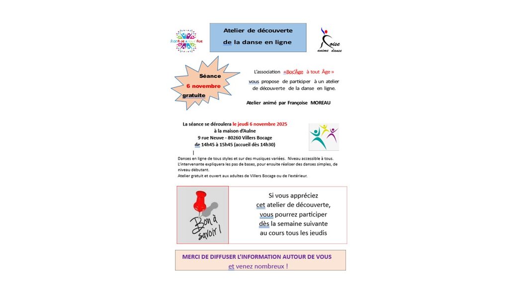 L’association Boc’Âge à tout Âge vous propose de participer à un atelier de découverte de la danse en ligne.