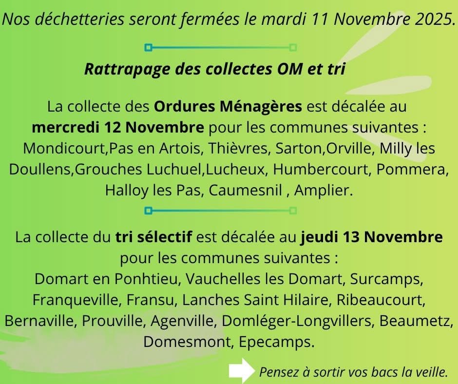 La collecte des ordures ménagères initialement prévue le 11 novembre 2025 est décalée au Jeudi 13 novembre en raison du jour férié.